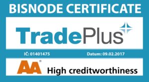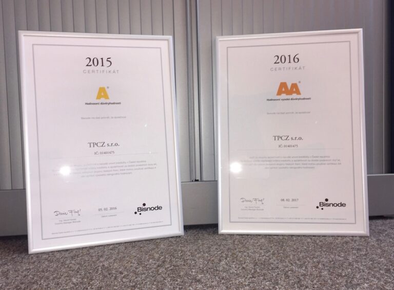 TPCZ s.r.o. has improved her financial rating to an AA rate. In 2015 we gained an A status, so the AA is an improvement. The AA certifcate is the second to best positiion which a company is able to receive. The certificate was handed out by Bisnode in the Czech republic. Bisnode is a part of Dun and Bradstreet worldwide network. This certificate gives you as a partner the assurance that you work with a financial fit company which is able to fulfill its duties.